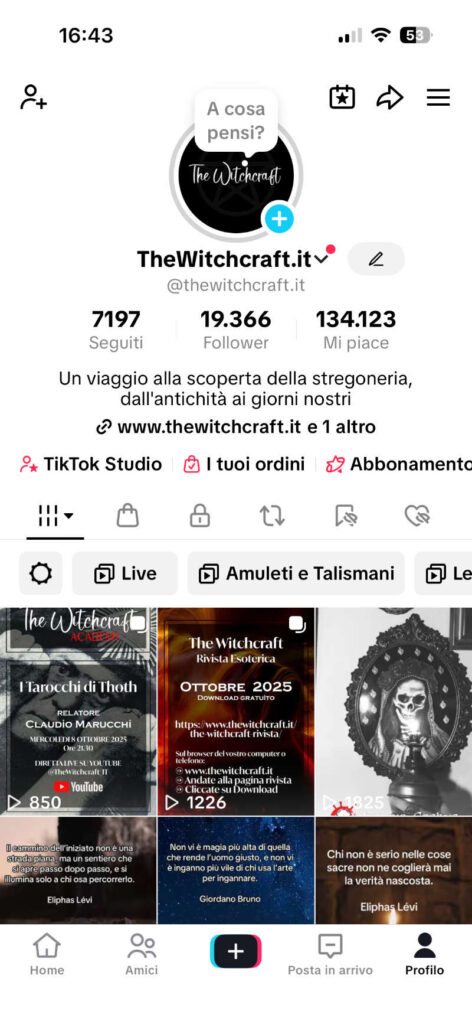 TikTok: video pillole su argomenti a carattere esoterico per incuriosire e avvicinare le persone trasmettendogli voglia di approfondire il mondo dell’esoterismo.